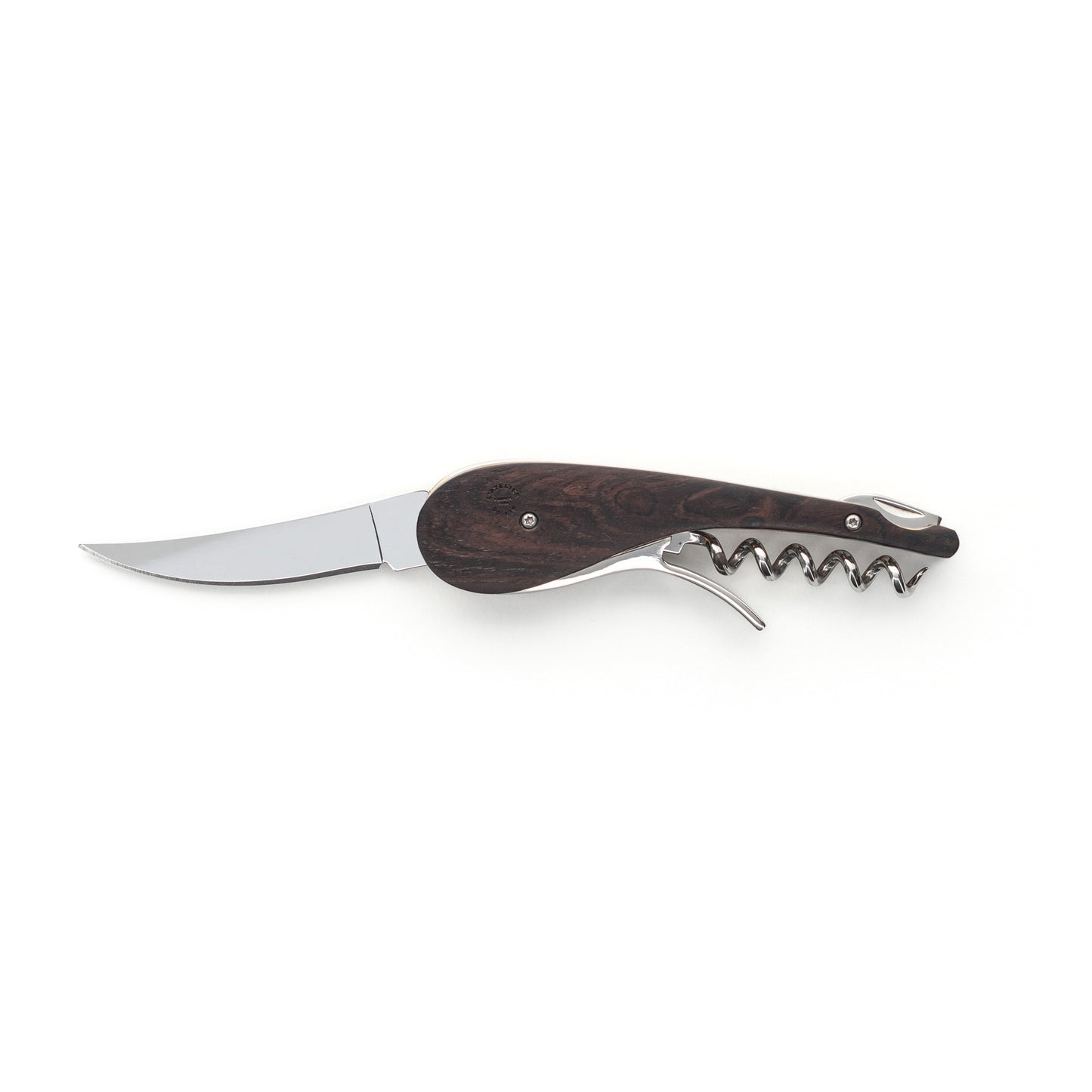 Compañeros de excursión en los viñedos, indispensables para un picnic campestre, el abridor del bodeguero y el cuchillo plegable del viticultor se reúnen en este audaz sacacorchos de sommelier aventurero.