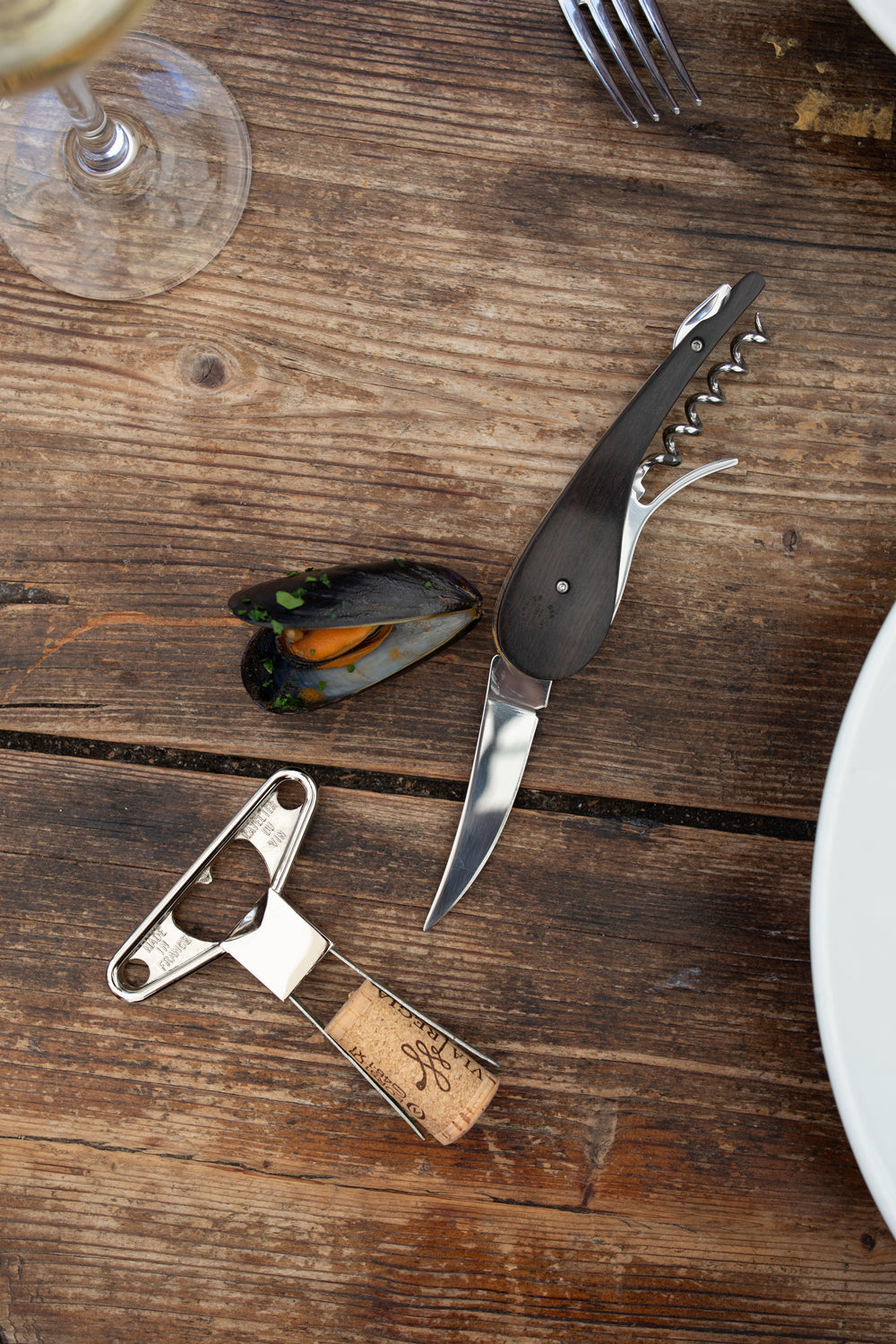 Nuestros antepasados lo sabían bien. Siempre hay que llevar un sacacorchos y un pequeño cuchillo. Cortar una rebanada de pan, acompañada de un trozo de queso. Abrir una botella de vino. En un bolsillo, un estuche, una cesta, a la sombra de un árbol o bajo las estrellas, dos utensilios bastan para encantar el día a día.